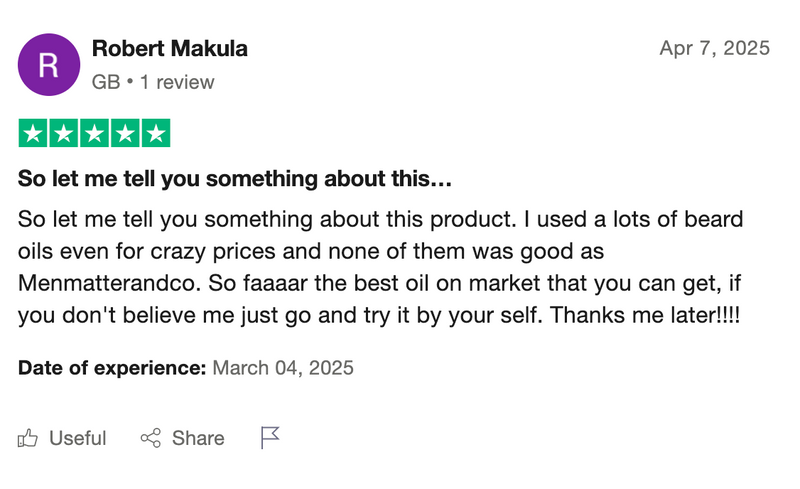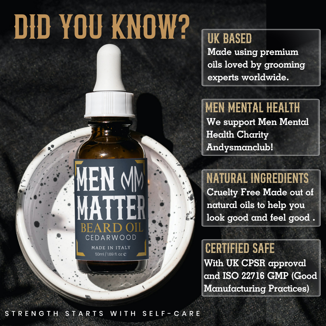 At Men Matter & Co, we’re more than a grooming brand—we’re a UK-based movement supporting men’s mental health. Crafted in Salerno, Italy, our Cedarwood Beard Oil blends tradition, quality, and purpose. More than grooming—each bottle contributes to a movement of well-being and self-care. Feel good. Look great. Make a difference.